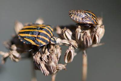 オクラにはおしゃれなブチヒゲカメムシがいたが、フェンネルの種には、ダンディなアカスジカメムシの姿が増えてきた。