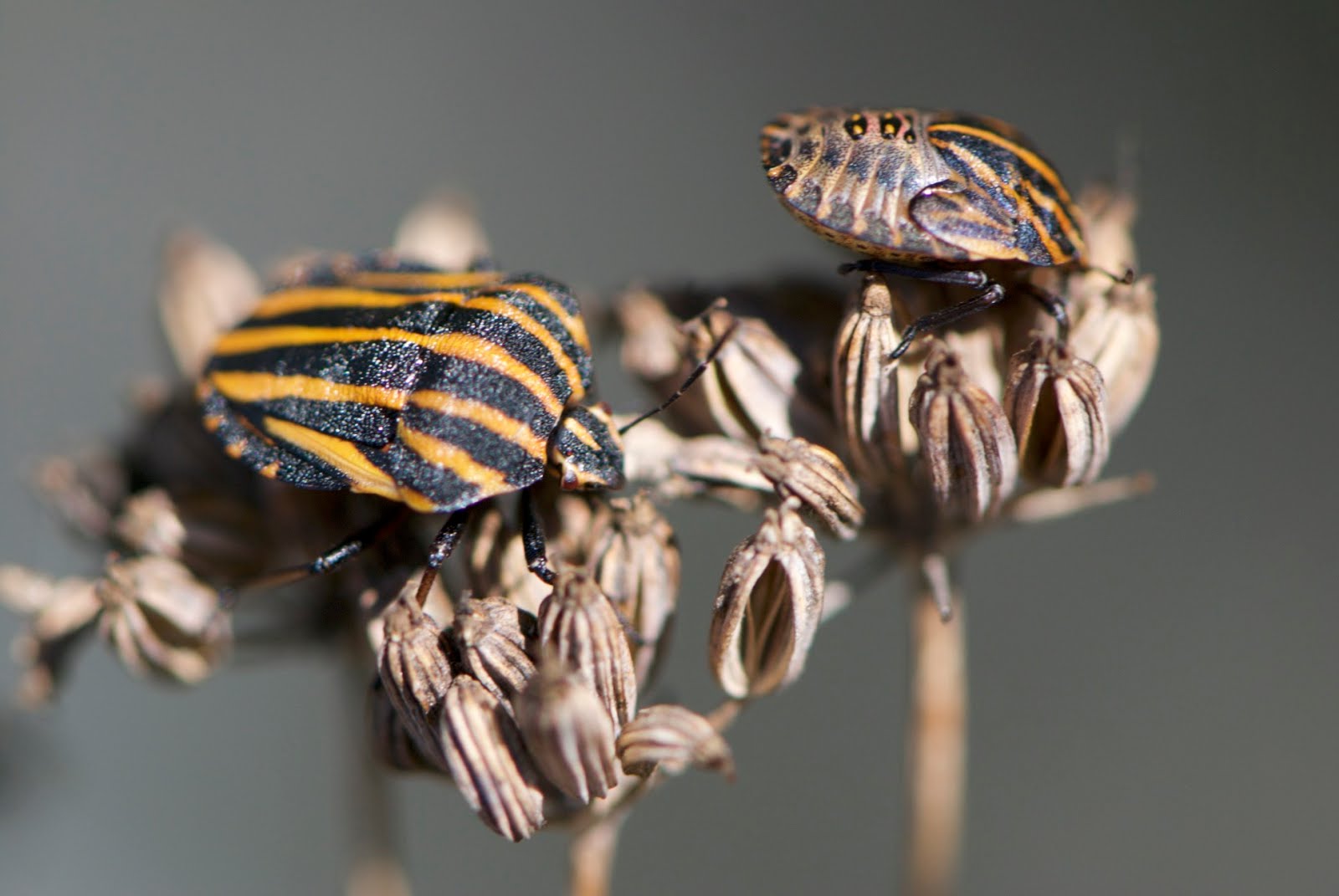 | 手前は成虫になりかけ、奥は5齢幼虫だ。 空洞になった種がいくつか見えるが、これはここにいるカメムシの仕業だろうか? |