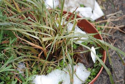| プランターに植えっぱなしで戸外においていたレモングラス。 雪が降るまでは、このままでも冬越し出来るのでは?と期待していた。 |