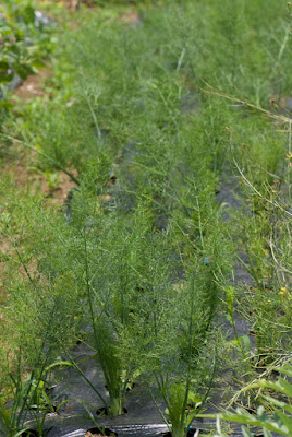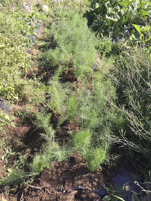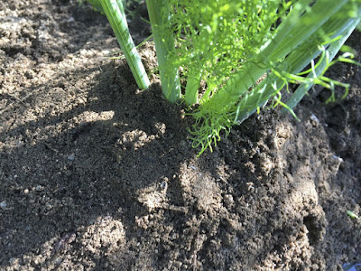 | こちらは、今急速に育っているフェンネルの株元。 小さな苗を畝に移植してちょうど1ヶ月だ。 もうじき収穫可能になりそうだ。 |