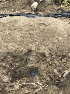 ところで、3月最初の日に春の嵐で、里芋の植え付け前の畝に掛けていたマルチが吹き飛ばされたので、Uピンで固定し直していた。