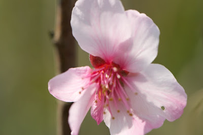 | この花は桜じゃなくて、アーモンド。 畑の側に植えている。 いつもより10日も早く一輪だけ咲いた。 |