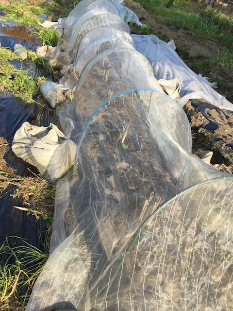 | こちらは第2菜園の防虫ネット。 ブロッコリーが成長すると、頭がネットの天井につかえるようになる。 そうなったら、防虫ネットを外す予定だ。 |