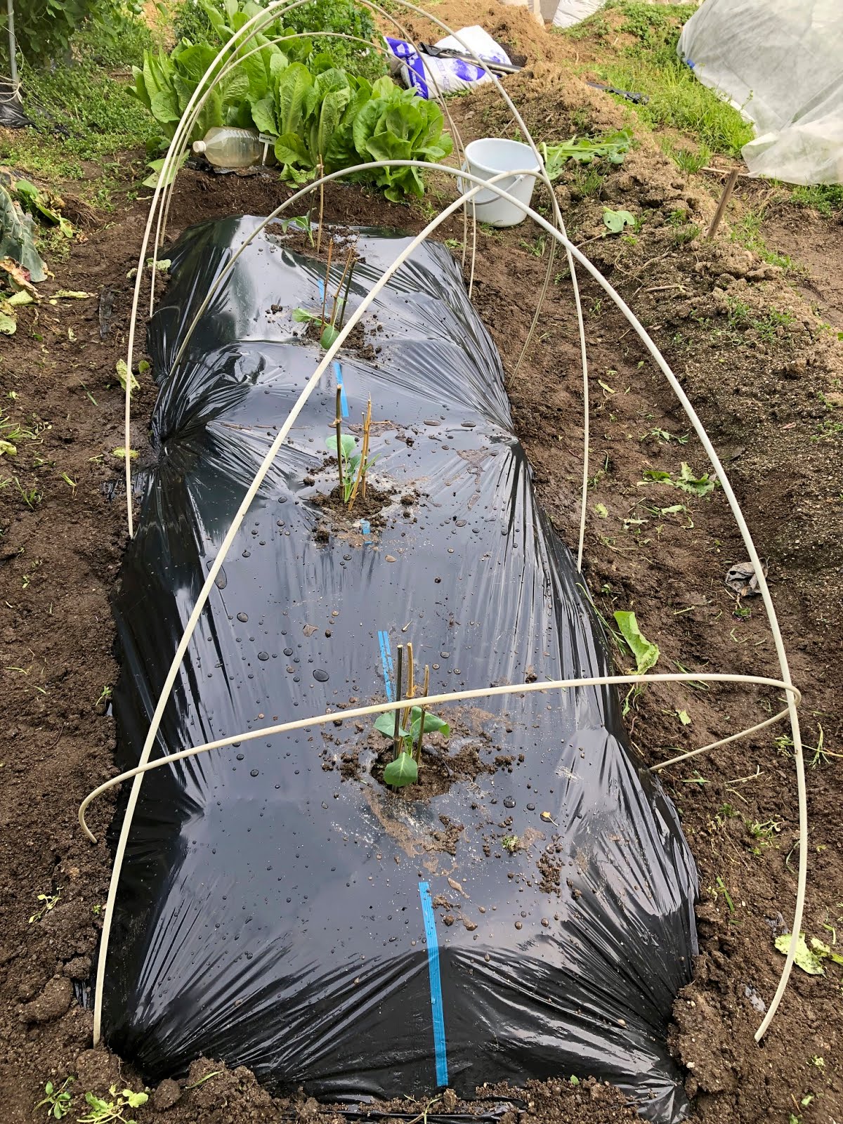 すぐ左手には、まだ収穫を続けているブロッコリーの畝があるが、こちらの防虫ネットやダンポールをそのまま流用することにした。