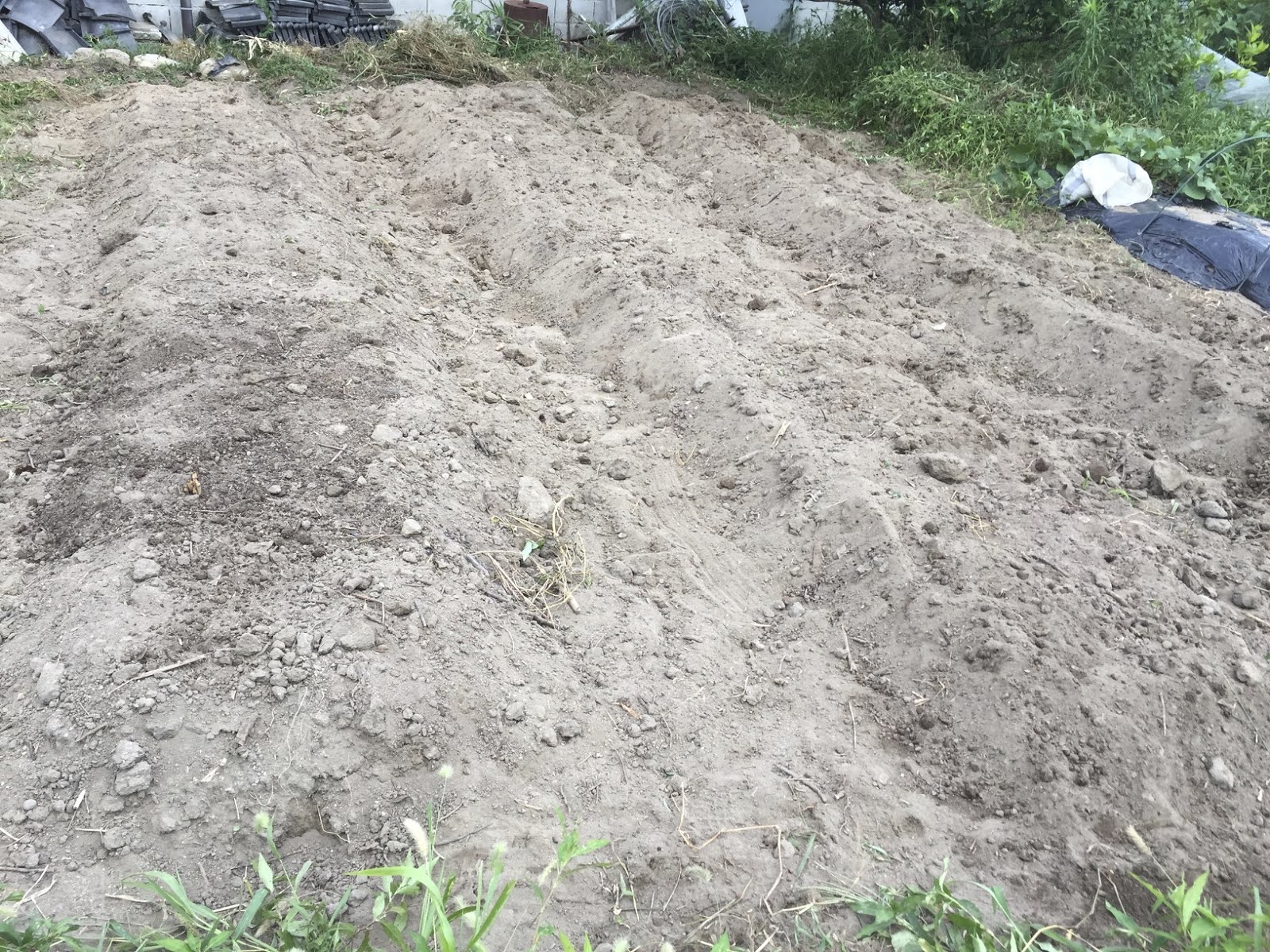 | 真ん中の畝には太陽熱マルチを掛けていた。 両サイドの畝と比べ、雑草はなかったが、土は若干硬い感じがした。 |