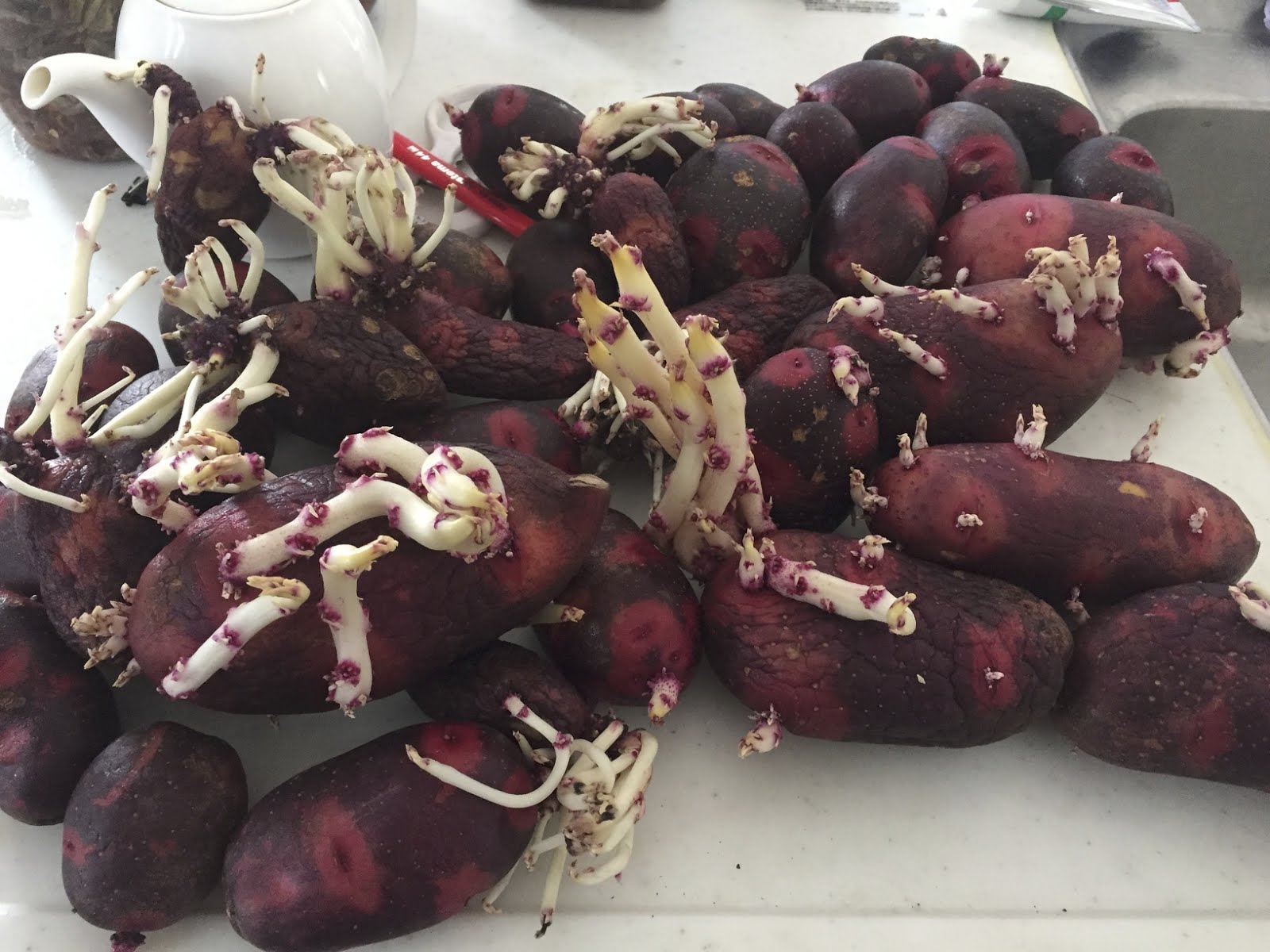 | 冷蔵庫の中では、今年冬に収穫していた芋がしっかり芽を出していた。 |