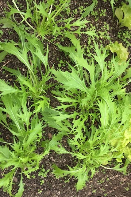 | 移植したばかりのいいさなチンゲンサイ。 奥にはもうすぐ収穫出来そうなミズナがある。 |