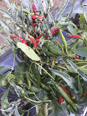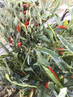 畑には収穫忘れのトウガラシが、まだ赤や緑の実をたくさん付けていた。