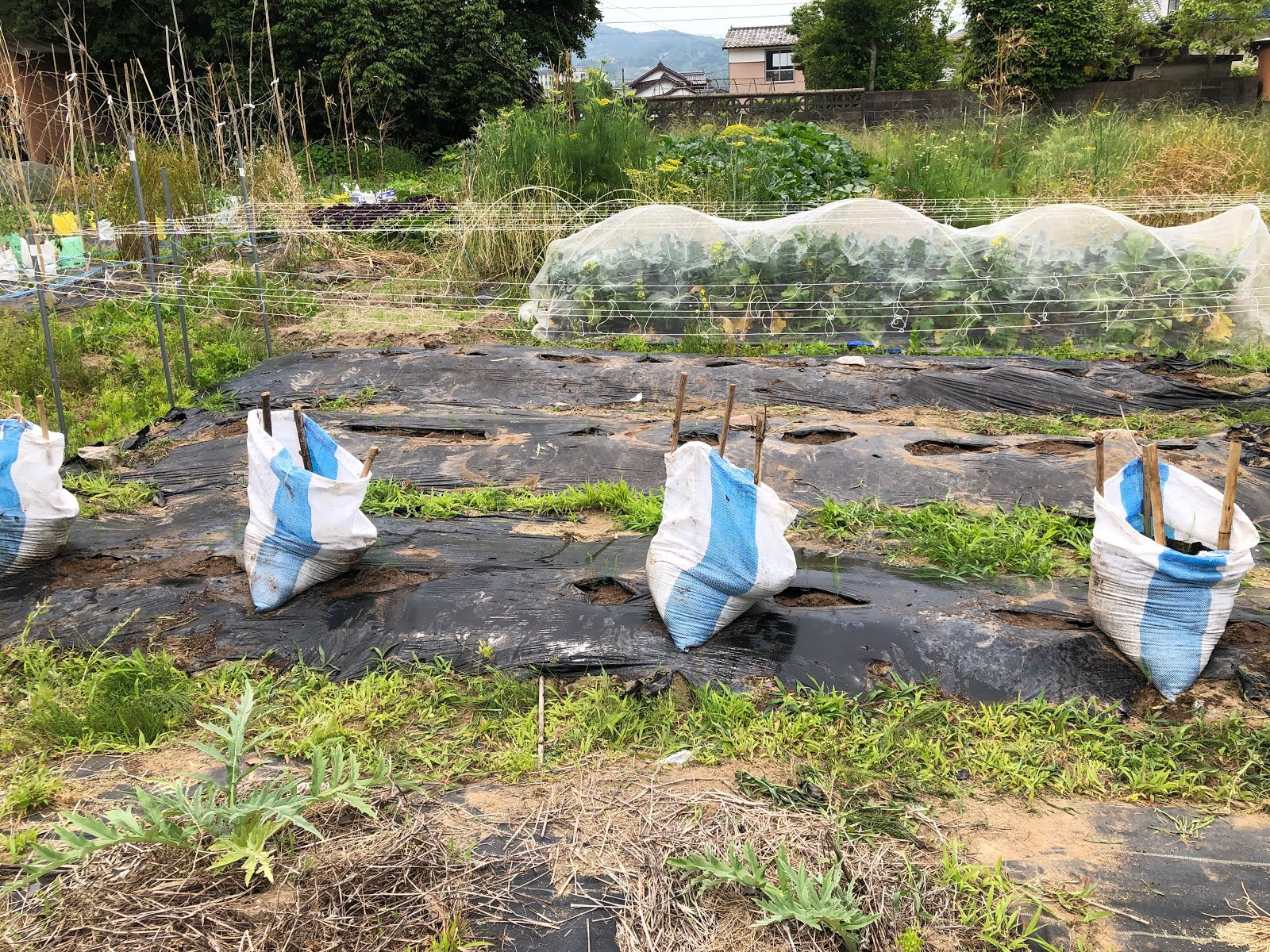 | 今年は第2菜園のメインの畝では多くの苗が枯れた。 だが、第1菜園の土嚢袋ではまだ小さいが枯れずに育っている。 そこで、今年は第2菜園にもこんな土嚢袋を用意することにした。 |