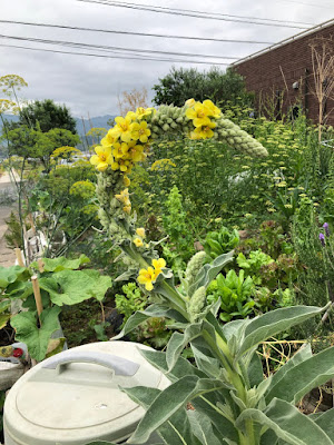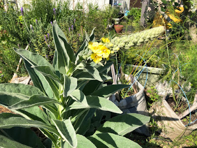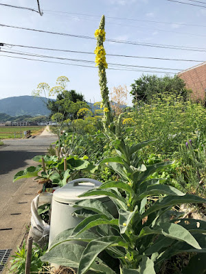 こちらは、我が家の菜園の端っこでまっすぐ伸びてきたビロードモウズイカ。