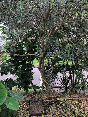 このポットを置いたのは、上の方に葉を茂らせているオリーブの木の下。