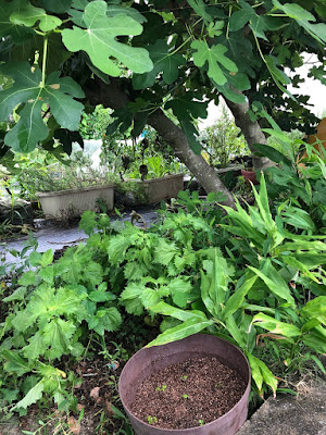 この丸型のプランターは、やはり風通しと日影が期待できるイチジクの木の下に置いた。