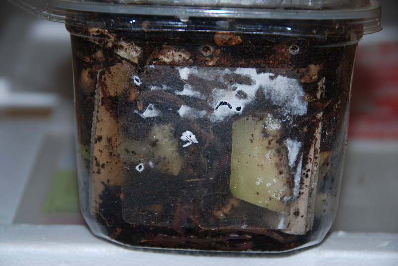 | こちらの区画には底の方にも多くのミミズが集まっている。もう餌を食べ始めたのだろうか? こちらも液成分は多いはずだが、一旦冷凍して毒性分が不活化された? |