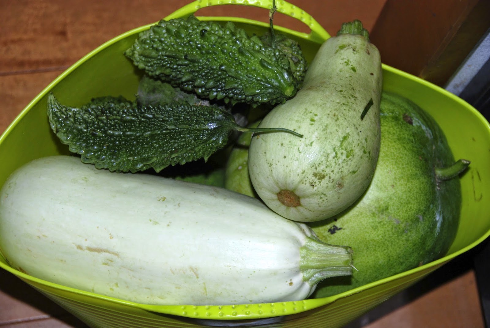 | 小雨の中でも収穫に行ってよかった。 もう少し時間を置けば大きい方の白ズッキーニは食べれなくなるところだった。 目的のゴーヤは予想通りの大きさのものが3本収穫出来た。 2個の冬瓜はお裾分け用。 |