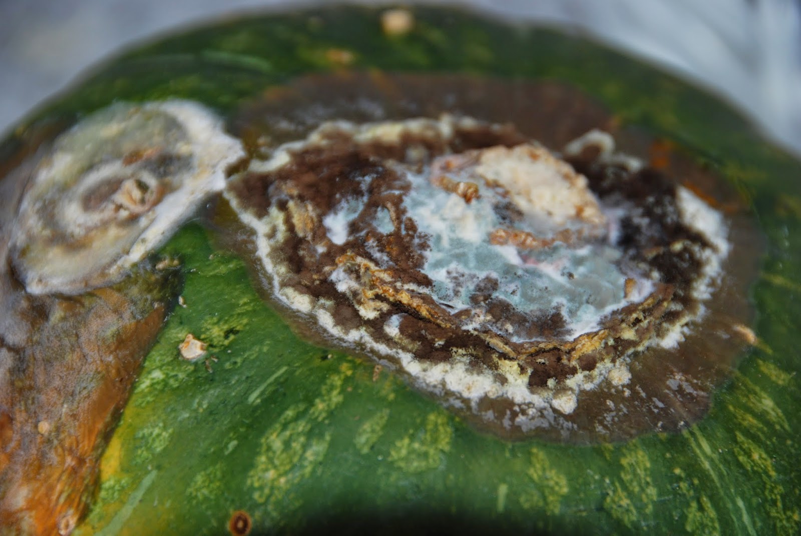 | 室内保存しているカボチャは腐れてもミズアブは寄ってこない。だからいい餌になる。 ところがミミズ小屋の側に置いていた腐れかけのカボチャにはミズアブが卵を産みつけた? |