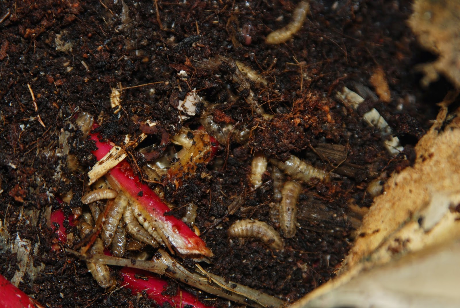 ミズアブは決して入ってこないように防虫ネットで囲んでいる4個あるどんぶり型ミミズ小屋の一つで、ボックス3段程多くはないがミズアブ幼虫が居たのだ。