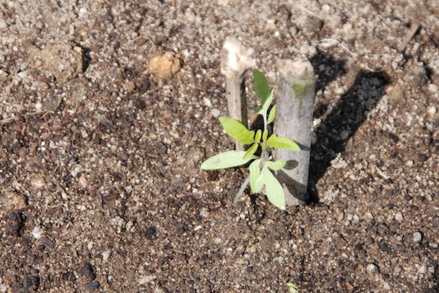 それでも、ポットに植えていたトマトの苗が、なかなか大きくならないので、4本地植えしてみた。