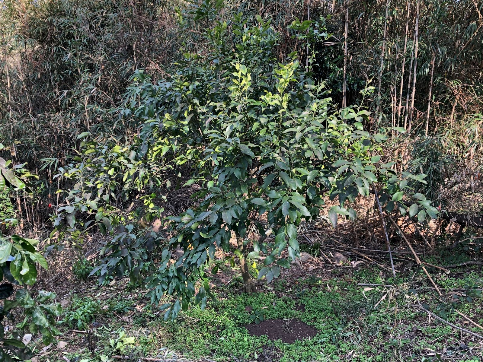 | この八朔の木からちょっと離れたところには真竹が押し迫っている。 しかし、木を圧迫していた竹は切り倒したので、風通しは良くなったはずだ。 |