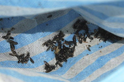| 小屋を包んでいた袋(座布団収納袋)の内側にもミズアブの乾燥死骸がいっぱい。 この夏の暑さと乾燥状態で、さすがのミズアブ君も生きながらえることが出来なかった。 |