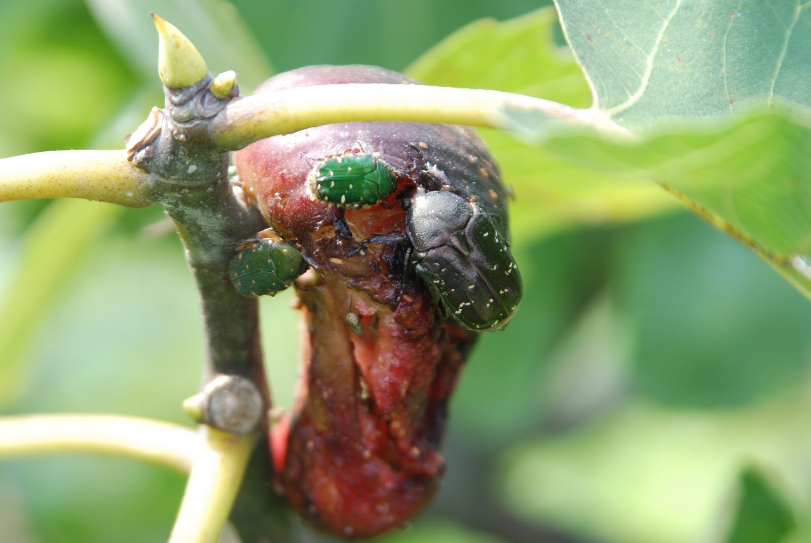 | ちょっと収穫が遅れるとカナブン達の餌になる。先日は小さなカブトムシも来ていた。 |
