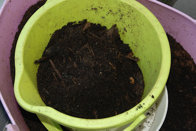 下の写真は、ミミズ君のいない下段の内容をバケツに移したところ。