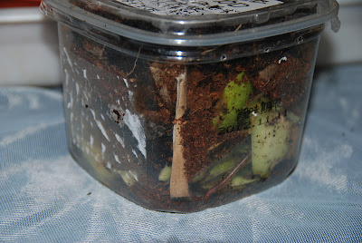 3区画に餌が投入され、後は冷凍した冬瓜の解凍待ちの状態。上から見て時計回りに冬瓜の皮、冬瓜の実質(果肉)部分、冬瓜の中心の種を含んだ部分、冷凍解凍後の冬瓜 を入れる。上方の共有スペースには22匹のミミズと、どうしても下に降りたくない時のために飢え死にしない程度のイモ類をココ繊維と共に入れておいた。
