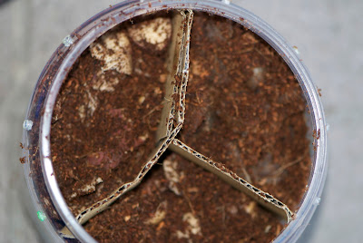 | ダンボールの上に共有スペースを作らないようにして、みみず君がその区画にとどまるようにしている。 今回は去年の実験より観察する空間が広いので、餌の食べ方だけでなく区画内の環境のチェックも出来そうだ。出来る堆肥の量はサツマイモが一番多くなりそうな気がするのだが実際どうだろうか? |