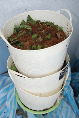 今日は、バケツ3段重ね(バケツ3号)の堆肥収穫の機に新しく設置するバケツの中をこのズッキーニの屑とココ繊維だけで詰めてみた。