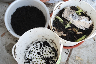 バケツの堆肥はほぼ出来上がっている状態で、ズッキーニの太い茎など全く見当たらず、餌になるような感じのものは全く残っていなかった。僅かなペラペラな繊維があっただけで、餌はほぼ完全に食べられた状態だった。