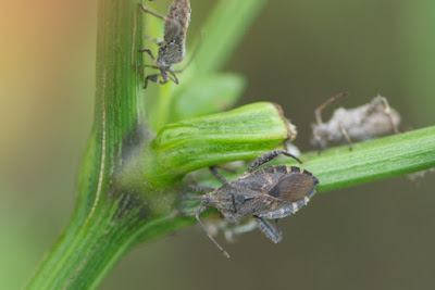 | これはクサギカメムシという種類だ。 先日カメムシについてネット図鑑で調べたので覚えた。 |