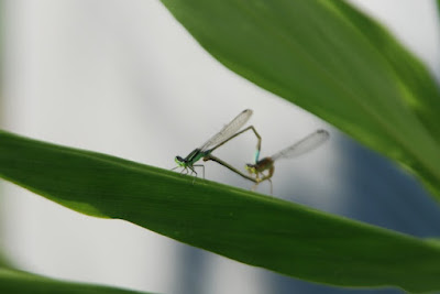 こちらはミョウガの葉に遊ぶイトトンボのペア。