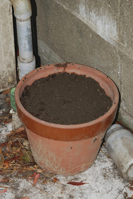 次に、4本程の地下茎を鉢に入れ、建物の裏に置いてみた。