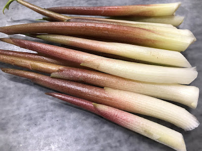 | 先端の硬さがある所がはえぐみがありそうなので切り取った。 今日収穫した芽は長いもので15㎝、短いもので8㎝くらいだった。 売っているミョウガタケは20㎝くらいあるらしい。 |