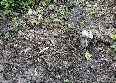 | 容器を置く前に芽が出始めていたものは先端が緑色になっている。 たくさんの白いミョウガタケを拝めると期待したのだが今回はまだ早かったようだ。 |