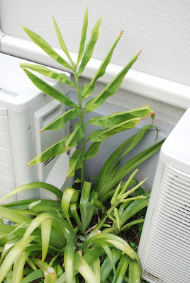 と、去年植えて枯れたと思っていたエアコンの室外機の間に植えていたミョウガが1本茎を伸ばしているのを思い出した。