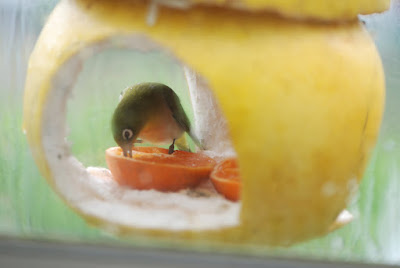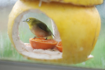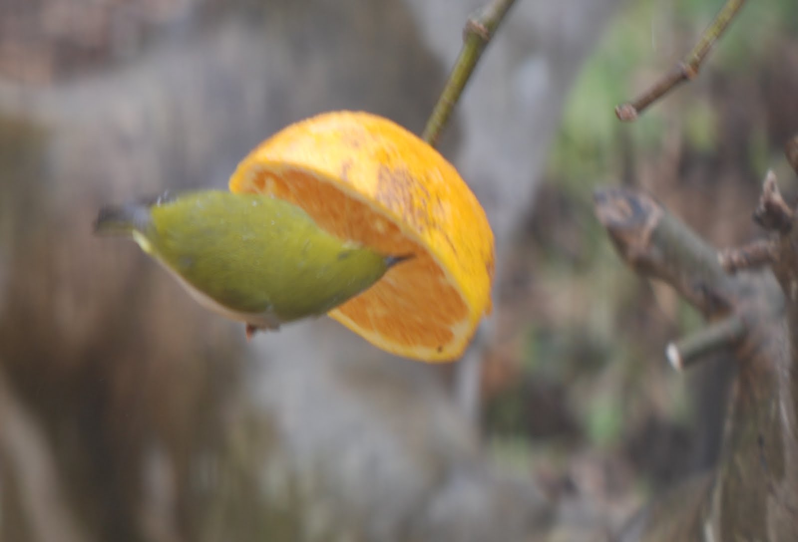 美味しそうに我が家のミカンを食べているメジロ君。 |