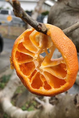 イチジクの木に設置したミカンは数日前から食べられていた。 食べているのはヒヨドリだろうと思っていた。 |