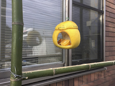 | 窓の中にはメジロ君が好きなミカンを入れている。 今年のメジロ君の家は、シンプルにバルコニーなしだ。 |