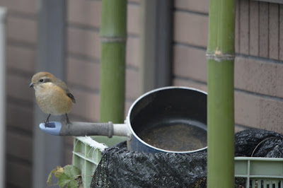 メジロ君が遊びに来ない時期は寂しいので、しばらくはモズに遊びに来てもらおうと、その真竹で出来た遊び場の餌場に、ミミズやミズアブを入れていた。