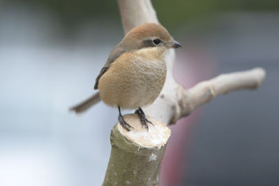 | こちらは、剪定したイチジクの木の上から、菜園を眺めているモズ。 最近私が与えている餌を時々食べにくるためか、太ってきた? |