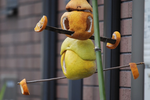 | 窓の中にはメジロ君が好きなミカンを入れている。 今年のメジロ君の家は、シンプルにバルコニーなしだ。 |