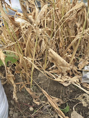 切り取った茎葉は、すぐ側の畝に溝を掘って埋めている。