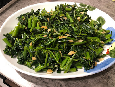 | 一方、こちらは今日食卓に乗っていた空心菜(エンツァイ)。 醤油、オイスターソース、ニンニクと一緒に炒めると美味しい。 |