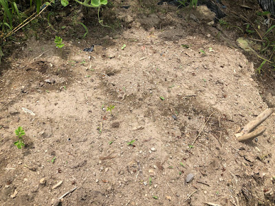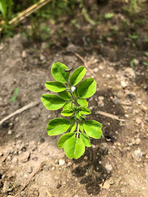 | よく見ると数本の芽が出ていた。 ここに育つ苗から、今年のお茶用のモリンガの葉を収穫する予定だ。 |
