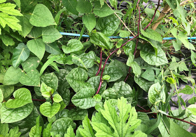 一足先に収穫が始まっている空心菜に続き、今日はツルムラサキを初収穫して帰った。