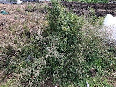 | 収穫を終え、小さな苗を植えて4年が経ったクコの低木。 収穫量は毎年増えているが、この木からだけでは我が家の必要量は収穫出来そうにない。 |