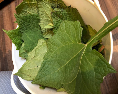 試し掘りは惨めな結果に終わったので、、ヤーコン芋の本格的な掘り出しはもう少し先に延ばすことにして、2日前はオリーブの葉でお茶を作ったが、今日はヤーコンの葉でお茶を作ることにした。