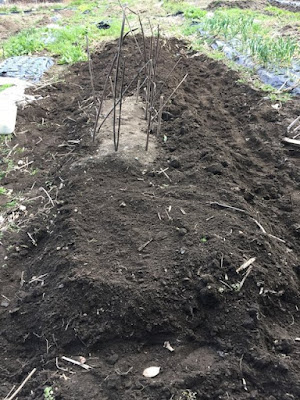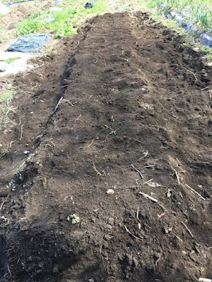 ということで、ヤーコンの種芋植え付け第2弾は、去年と同じ場所に広めの畝を立て、2列に植えた。