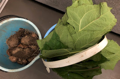 ヤーコンの葉はお茶用に収穫するのだが、3週間前に一度ヤーコンの葉を収穫した時より、今日はもっと大きな立派な葉になっていた。