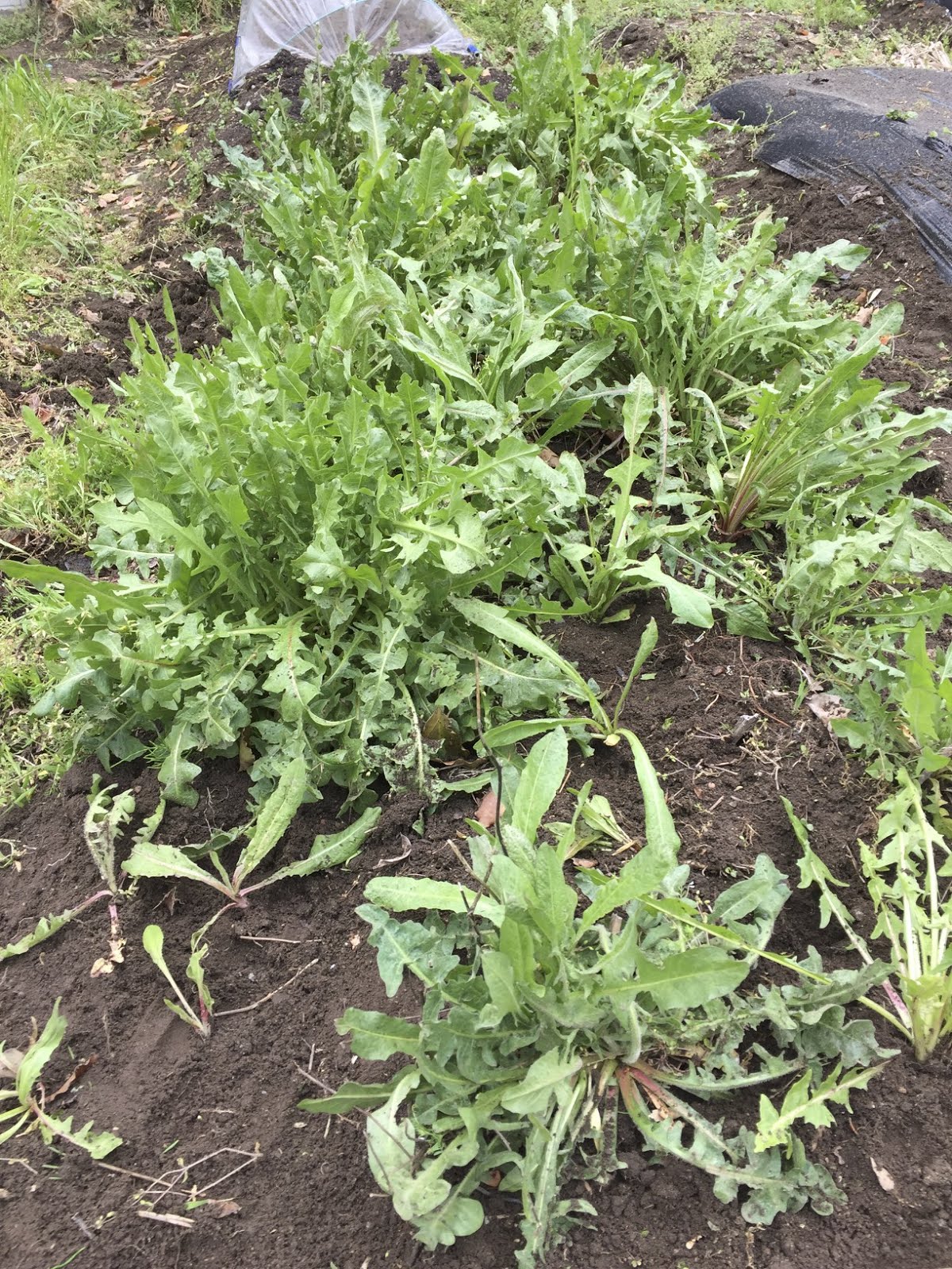 | 葉がギザギザなのが『ダカンポ』、スムースなのが『カタルーニャ』。 どちらも根が発達するので、根まで収穫してチコリーコーヒーを作ることができる。 根まで収穫したところには、株分けした小さな苗を移植している。 |